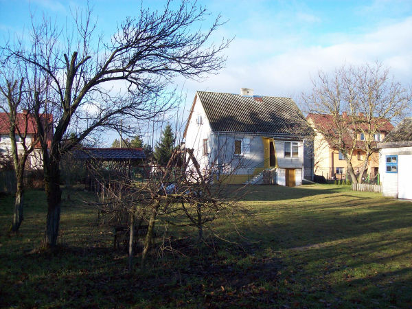 Ogród na podwórku już istniał przy zakupu działki w 2014 r. Dom otoczony jest trawnikiem i ogrodem tradycyjnym. Rosną tu rośliny ozdobne, np. wierzby mandżurskie, lilaki, jaśminowiec, pięciornik i astry nowoangielskie. Był warzywniak, w którym rosły łoboda i zioła jak mięta, lubczyk i szczypior. Nadal są tam też tradycyjne drzewa i krzewy owocowe. W starym sadzie rosną jabłonie, śliwy, grusza i czarne porzeczki. Za domem rośnie duży orzech włoski i przy altance jest pigwa. Przy drodze wiejskiej, więc na zachodnim brzegu działki, jest żywopłot z świerków, który tak szybko rośnie, że trzeba go skracać od czasu do czasu. Od marca 2016 r. jest tu mały inspekt z specjalnym systemem nawodnienia. Później na podwórku sadzono jeszcze urodliny (paw-paw), głożyny (jujuby), żółtodrzewa i gruszy ussuryjskie.